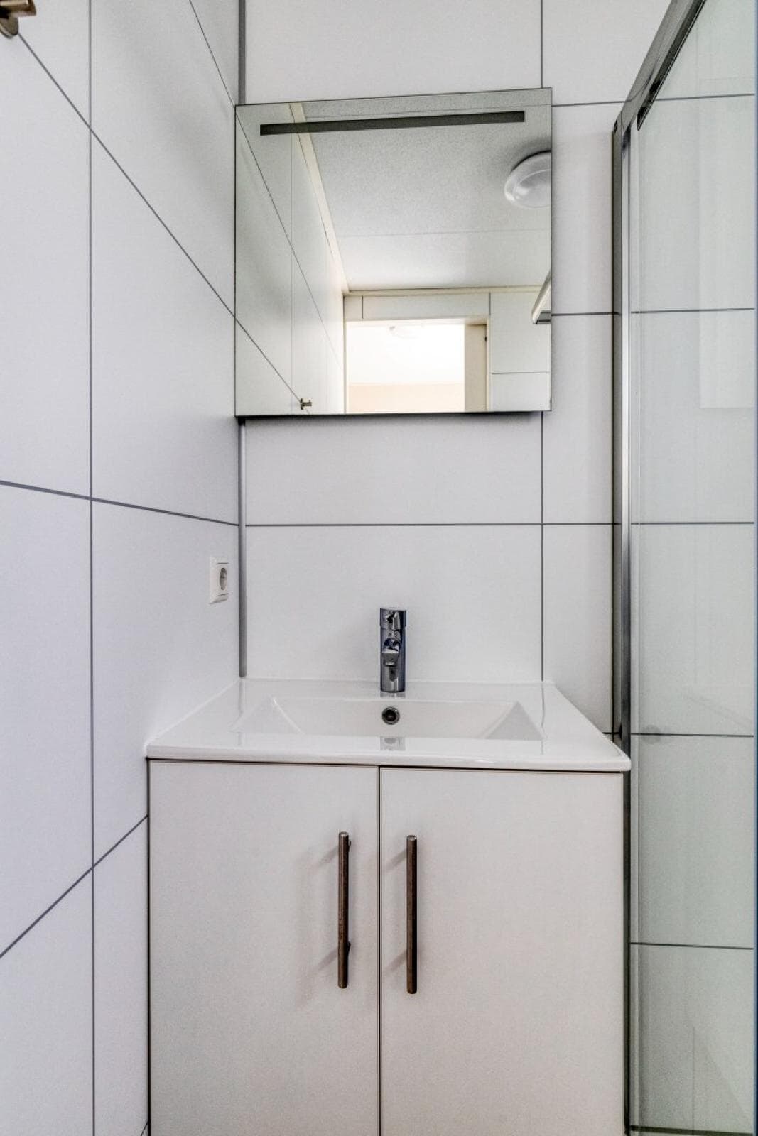 Badezimmer mit begehbarer Dusche, Waschbecken mit Möbeln und Toilette.